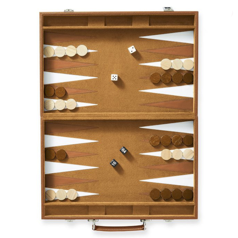This portable backgammon set, available in either a leather or a raffia travel case, is perfect for families staying in or when game night hits the road.