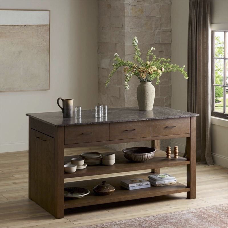 • Island life. For those looking for kitchen solutions, Four Hands debuted several smart pieces. Its Divina Kitchen Island has plenty of space for countertop chores and also includes a waterfall table that pulls out and tucks back into the main frame.