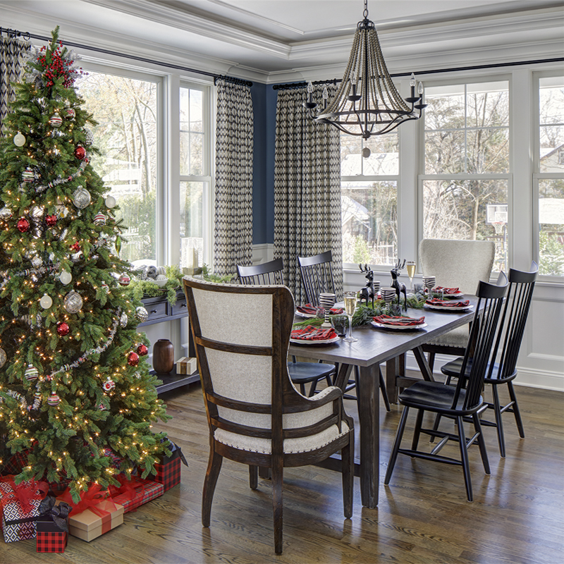 The less-is-more approach works well in this dining area, where simple florals and single evergreen branches replace opulent centerpieces. Less-decorated pines in powder rooms, by windows and staircases can add flare, adds Ivanka’s designer Milena Eror.