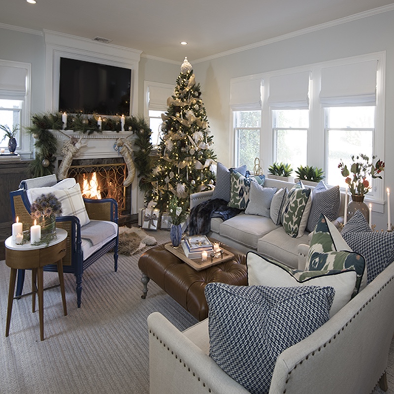 When you move into your new-construction home right before the holidays, obviously you need to make it festive. Designer Kingsley Belcher Knauss of KBK Interior Design went tastefully seasonal for these clients in Westfield, adding poinsettias and fresh garland to contrast—but not overpower—the blue-and-white theme throughout the first floor. Pinecones and stockings add a natural touch to the family room mantel.