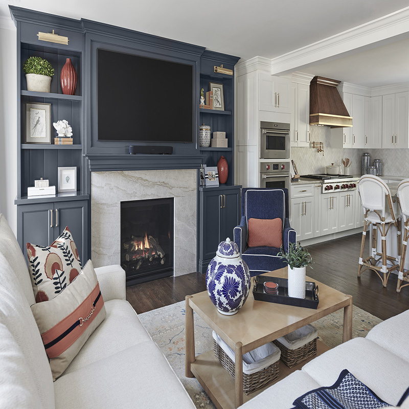 This Basking Ridge renovation, designed by Pam Cooper of Cooper Interiors, opened up the boxy ’70s layout into an open concept perfect for a couple expecting a baby. The crown jewel of the living room is this custom built-in, painted with Benjamin Moore’s Hale Navy for the perfect pop.