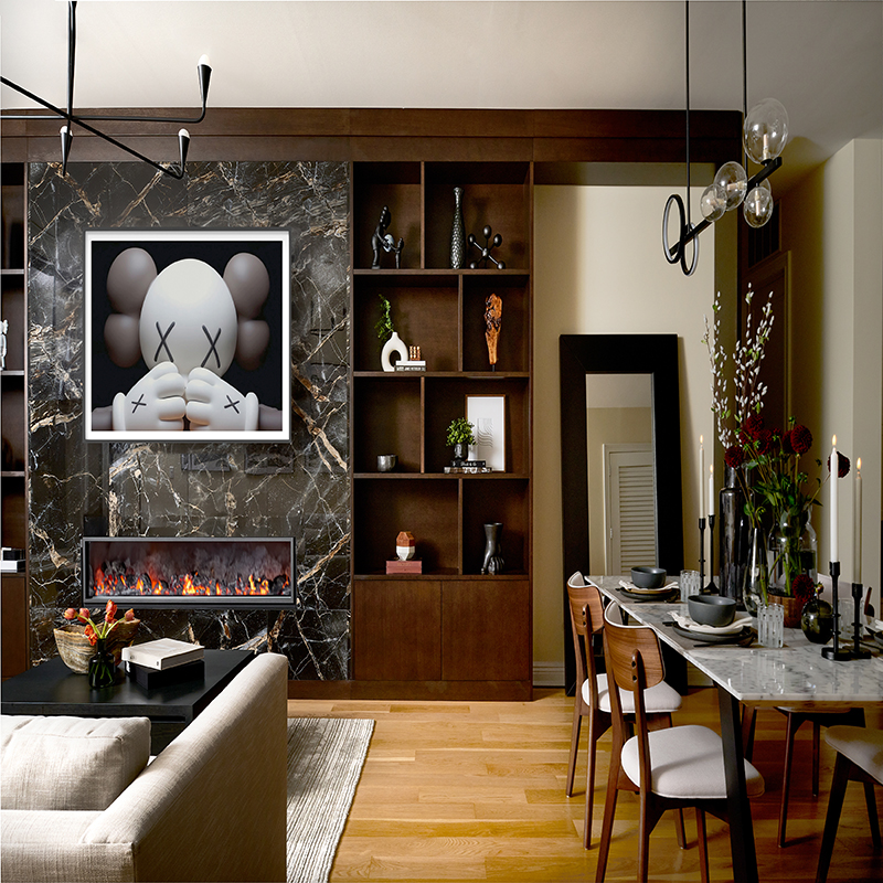 The vibe is modern and edgy in this Edgewater condo. Kathy Samaan of the Samaan Design Group curated the living room precisely, and the deep walnut wood on either side of the electric fireplace has an eye-catching effect.