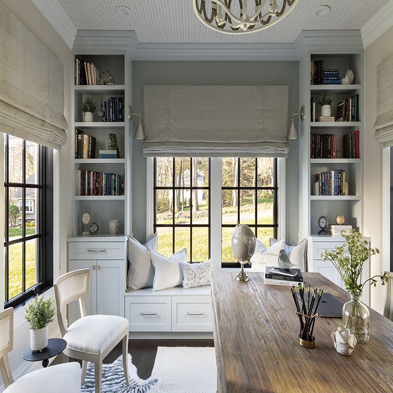 The office built-in of this home in North Caldwell also offers a cozy nook for reading, lounging and taking in the view. Marissa Sauer and her team at Design Macs added a plush hide carpet for extra comfort.