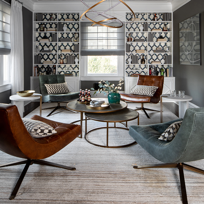 Every room of this Maplewood home makes an impression, thanks to Karen Wolf of K + Co. Living. The cozy lounge is no exception, and the patterned backs of the shelves of the built-in add visual interest to a room bathed in soothing gray.