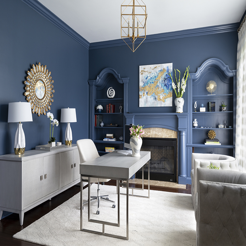 Laurie DiGiacomo of the eponymous design firm drenched the home office of this house in Upper Saddle River in blue. The built-in shelves provide the perfect space for the homeowner, who is a doctor, to highlight both family and career.