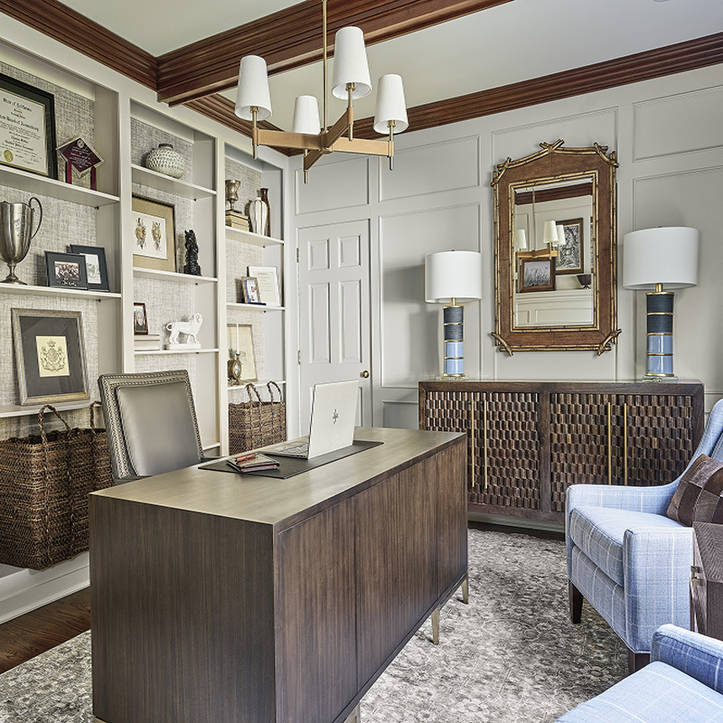 The home office in this North Caldwell home, designed by Marissa Sauer of Design MACS, includes a carved wood desk, a cutout chandelier and soothing shades of blue and silver.