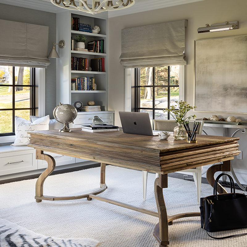 In this Basking Ridge office, designer Pam Cooper curated shelves for a Zoom-worthy background and created a window break area before a masculine executive desk.
