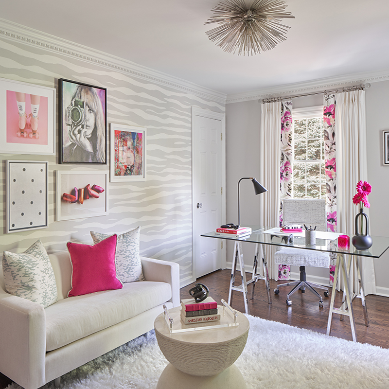 The colorful redo of a Ridgewood home included this pink-and-white office. Designer Jennifer Pacca incorporates a glass-topped desk, pops of hot pink and a funky collection of wall art.