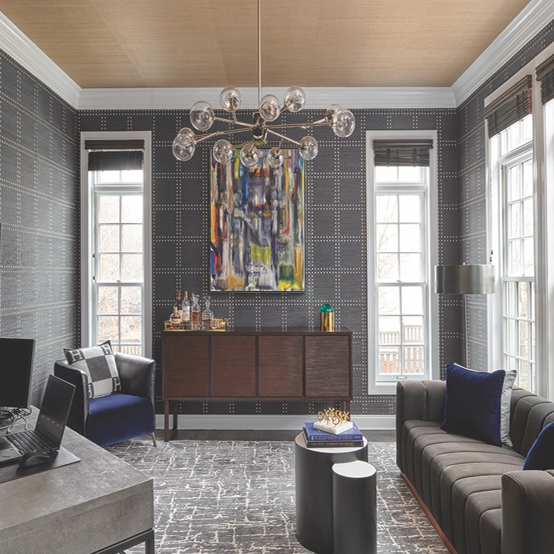 In a Livingston home redesigned by Kathryn Cook, the office/library is modernized with statement-making wallpaper and motorized solar shades.