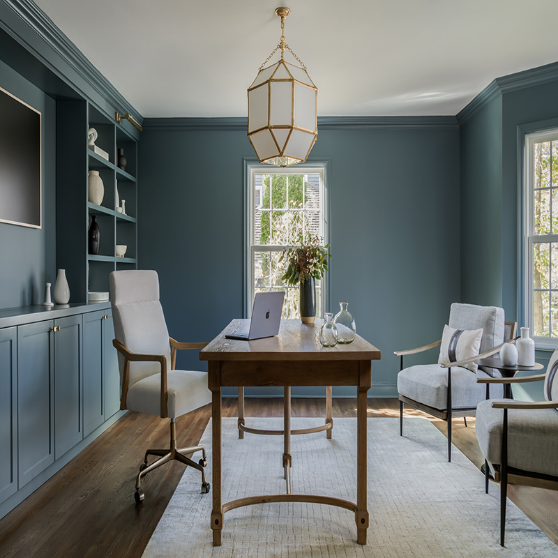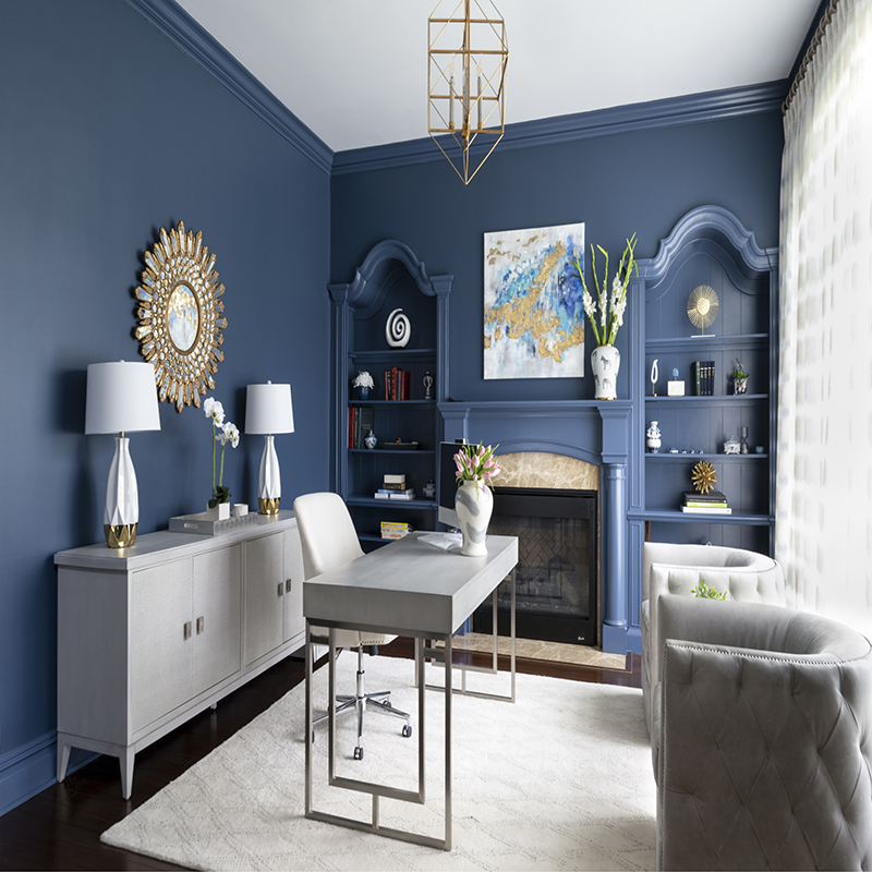 Designer Lisa Santoro gave a Morristown attorney exactly what she needed: A home office in warm blue that makes for a comfortable working environment.