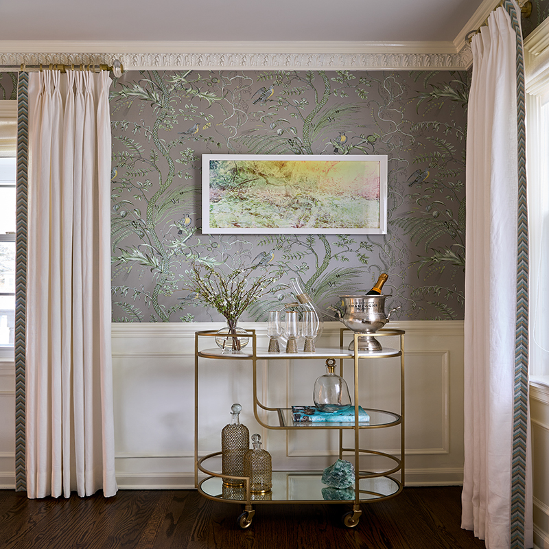 The elegant Chinoiserie wallpaper from Brunschwig & Fils in this Ridgewood home, designed by Jennifer Pacca of the eponymous design studio, is decidedly dressy but never overwhelms the space. The bar cart adds a less formal touch.