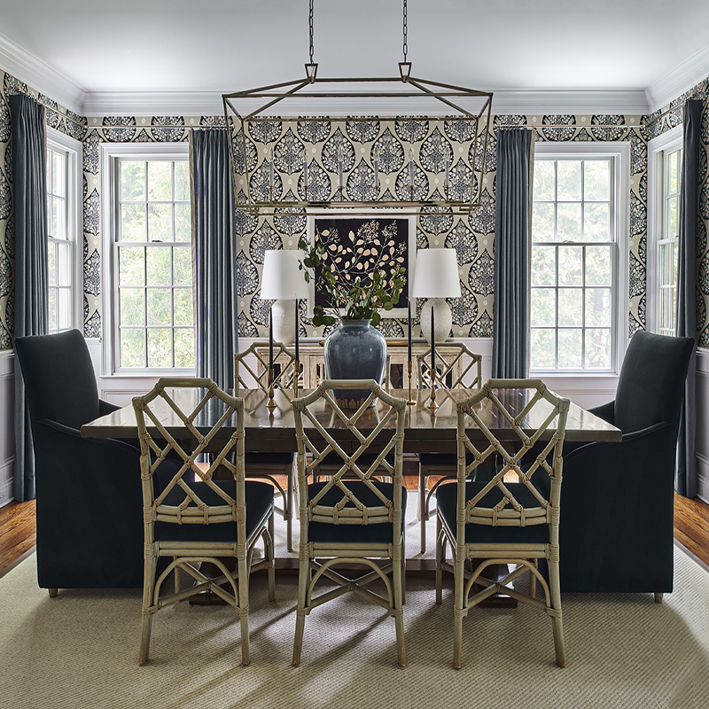 Over in Chatham, the owners of this colonial trusted Emily Gerne and Genevieve Bottoni of EGB Interiors to ease them into the world of bold colors and patterns. The dining room, bathed in blue and complemented with a stunning Lotus wallpaper, proves that trust paid off.