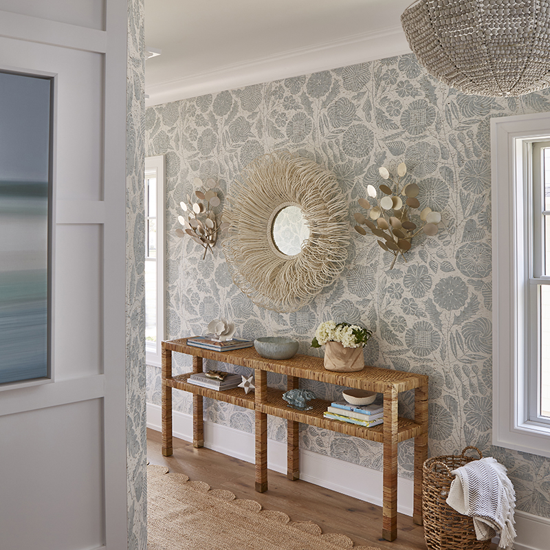 This light-filled Avalon summer home achieves what designer Karen Wolf of K+Co. Living calls a “sunshine and mimosa” style—bright, happy and cozy. The entry foyer offers the perfect encapsulation of that with its mix of textures, artwork and beautifully floral wallpaper.