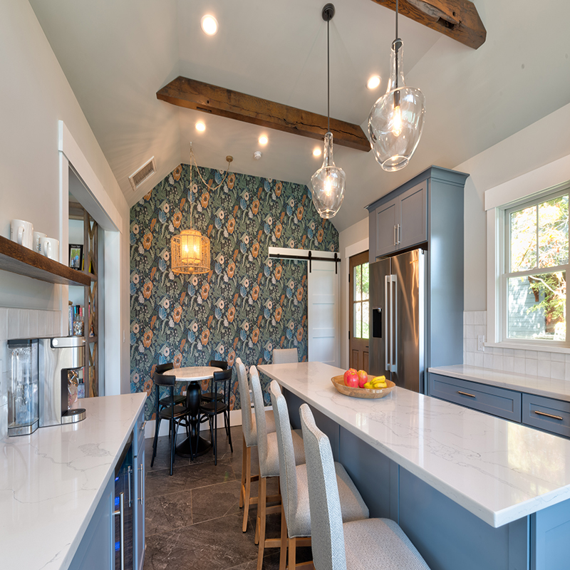 Offering the perfect blend of rustic and modern, this lakeside home in Ringwood is not lacking in charm. Designer Cozette Brown used A-Street Prints “Anemone” wallpaper from Brewster Home Fashions to give the small kitchen a fresh, modern feel.