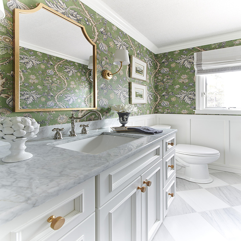 Pam Cooper of Pam Cooper Interiors packs plenty of style into the powder room of this Basking Ridge home. The green and the large-scale “tree of life” pattern feel bright and alive, and the brass wall sconces and mirror complement it perfectly.