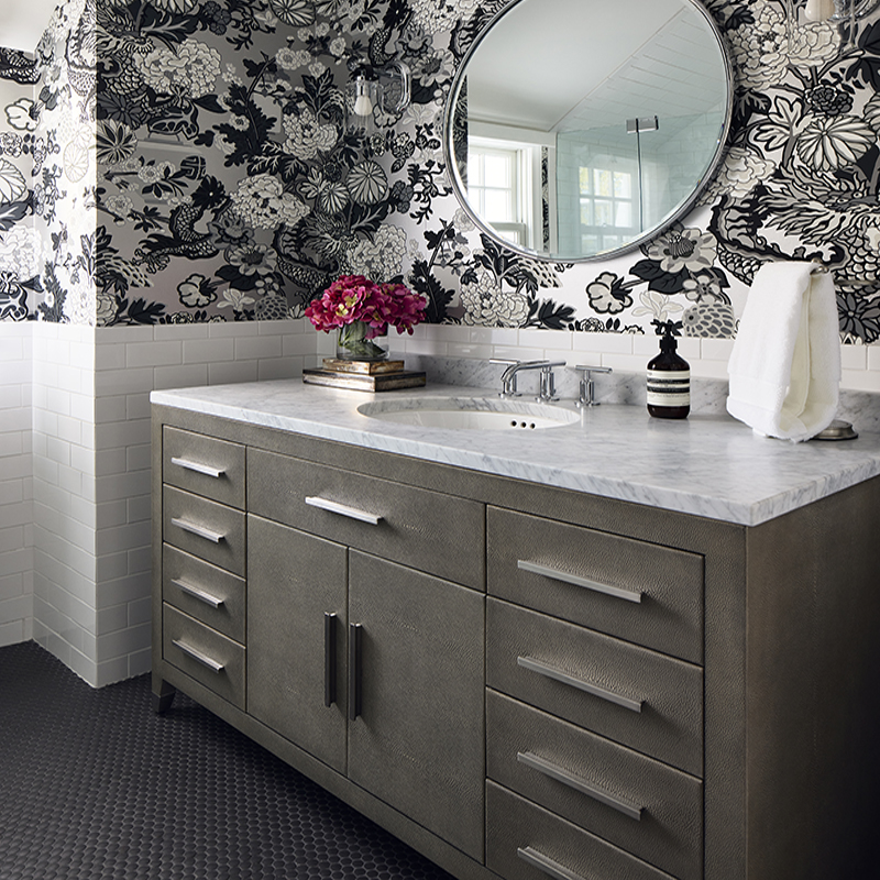 The wallpaper in the bathroom off the primary bedroom of this Summit home, designed by Stivale Graffam Home, is meant to be transportive, encouraging the mind to wander to far-off places. As a counter to the bold pattern, the sink and tiles are a simple, clean white.