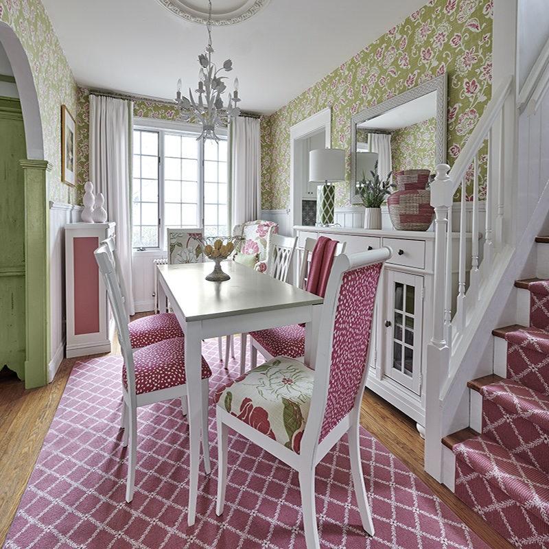 Also designed by Cooper, this Far Hills home is filled with joyful color and pattern. In the very cheerful dining room, clean white trim and a white pendant light play counterbalance to the green and pink hydrangea wallpaper, which Cooper calls a “jumping off point” for the rest of the room.