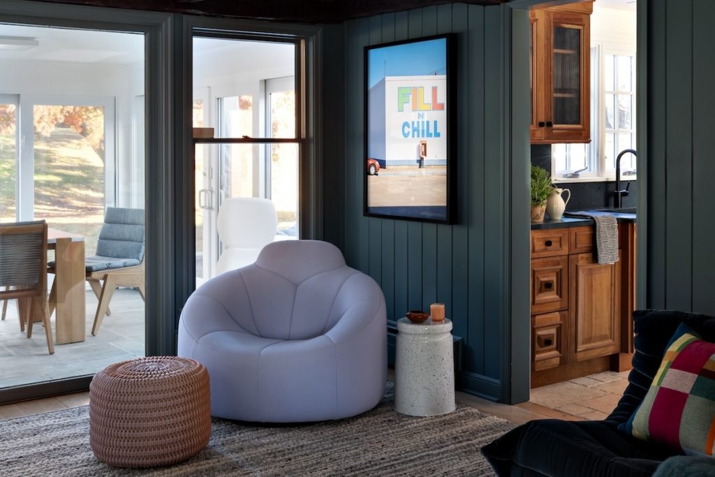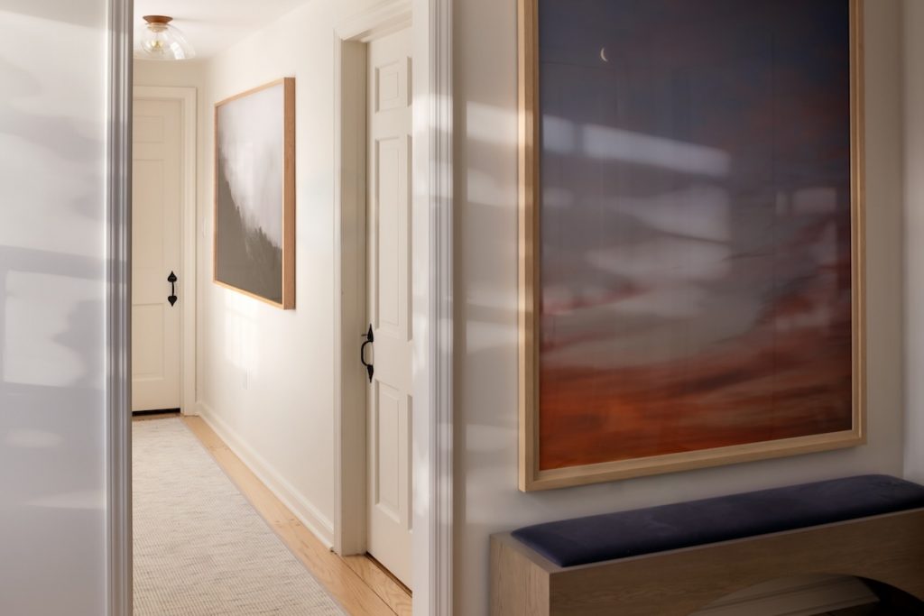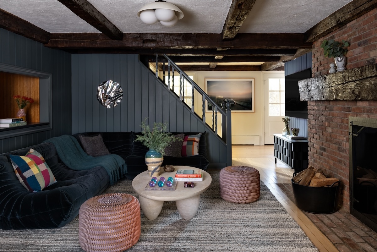 “We wanted to blend the beauty of the cottage’s original details—big beams salvaged from the local train station that had been demolished decades ago, wide plank floors and wood-paneled walls—and mix those with furniture, lighting pieces and art more aligned with our client’s aesthetic,” Strat explains. “We love a good design juxtaposition. The bones of the home are very cottagecore, but we wanted to bring in modern elements to offset the rustic touches.”