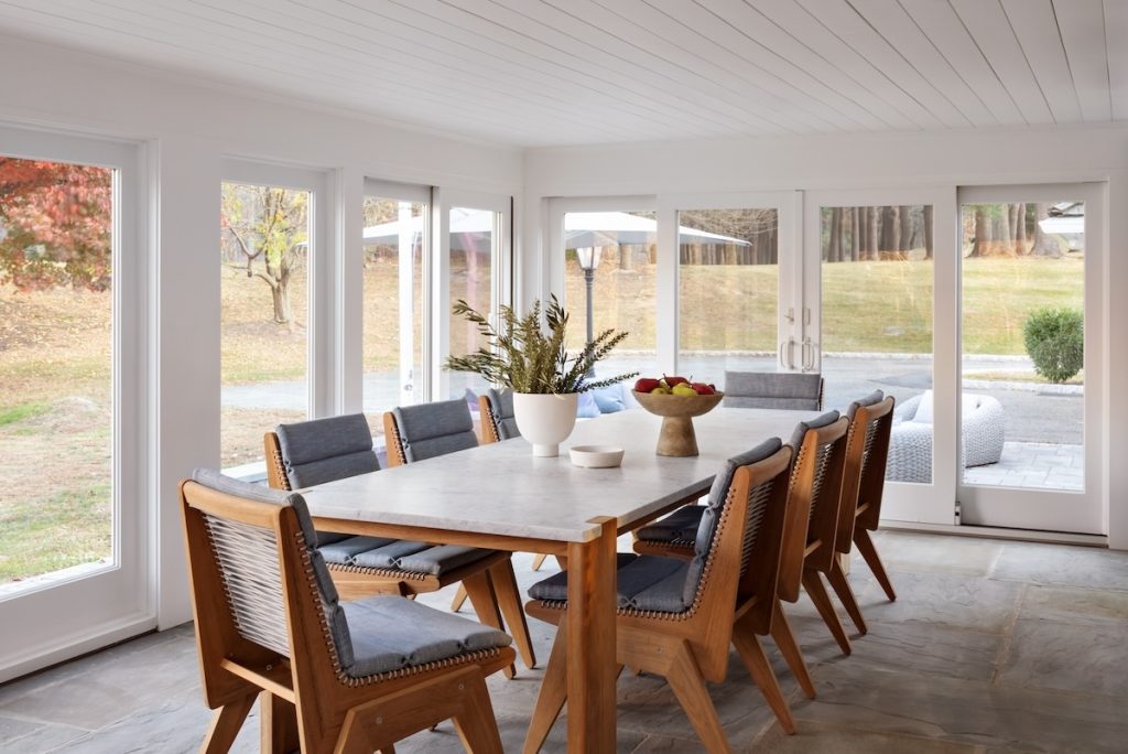 The enclosed back patio offers three-season living spaces: Off the den, the dining room serves as a casually elegant spot to gather for great food and camaraderie around the David Sutherland teak dining table with a Carrara marble top. Off the living room, a lounge section lets guests chill in handcrafted Dedon chairs. And just beyond, the outside patio near the pool sports a luxe outdoor sectional and coffee table from David Sutherland and stylish Manutti chairs.