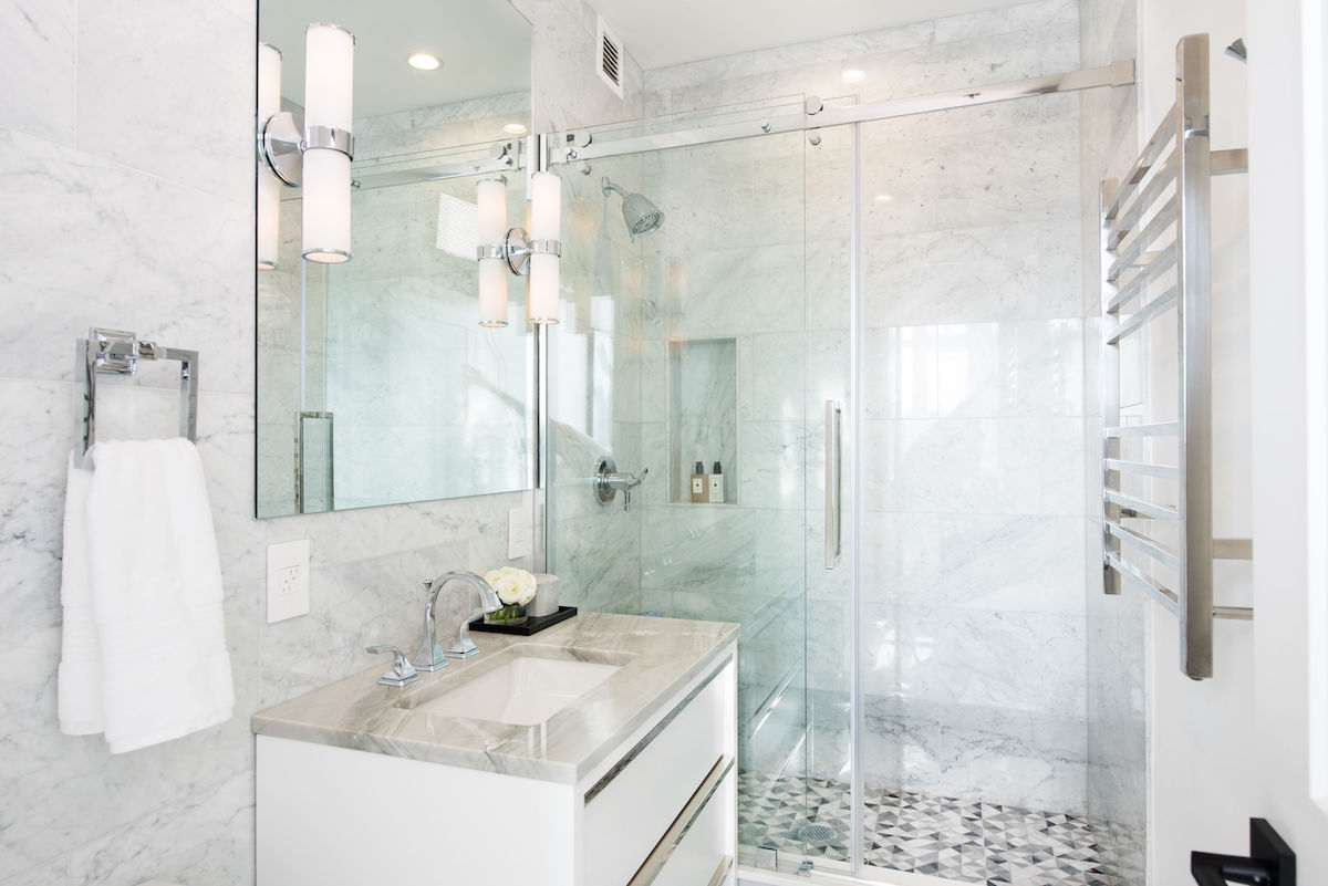 Marina Cheban’s 30-something clients Leyla and Adam Bilali had three requests when gut renovating their Hoboken condo—create a ton of storage, add a third bedroom, and make sure everything is white on white on white. It wasn’t an easy task since they couldn’t increase the square footage of the space and found getting permits from The Hudson Tea Building’s board took longer than expected. But after a year-long renovation process once they purchased the home in August 2017, the end result was worth the wait, giving them the open, modern and bright 3-bed, 3-bath they were hoping for.