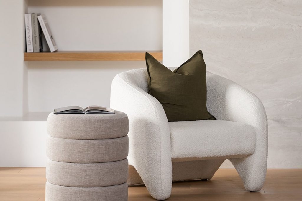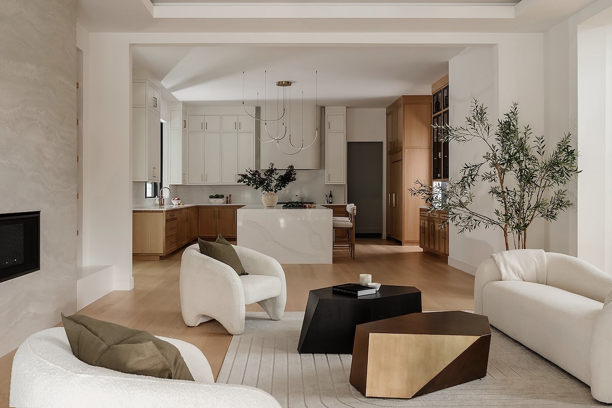 In contrast, the kitchen and family room offer a more measured calm. Custom white oak and off-white cabinetry in Sherwin-Williams Natural White stretches to 11 feet, its simplicity enriched by Top Knobs gold hardware. A curved, Venetian plaster hood introduces texture as a quartz waterfall island grounds the space. Rope-hung, Kuzco Lighting linear pendants echo the home’s gentle curves as a continuous quartz backsplash mirrors the countertops for a seamless finish.