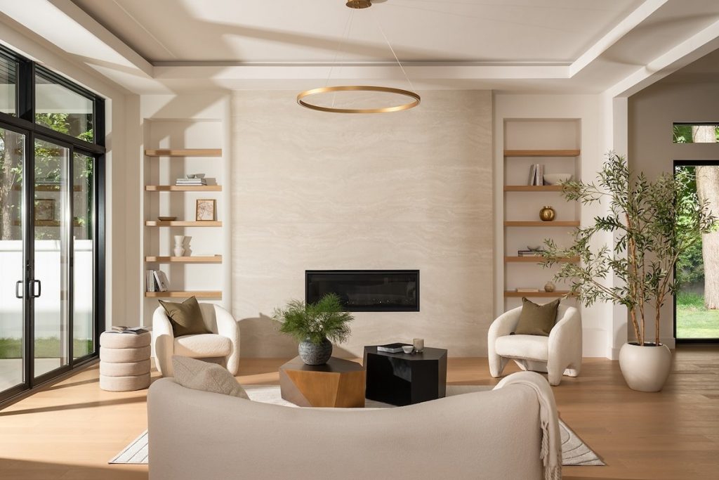 The family room extends the quiet harmony with an accent ceiling bathed in LED light and white oak shelving illuminated from within. A travertine-look, porcelain tile fireplace surround adds subtle movement and Andersen sliding doors glide open toward the poolside marble patio, extending interior and outdoor comfort.