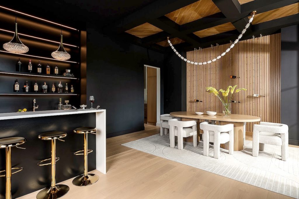 “Every material and detail had to be not just beautiful, but also connected from one space to the next,” Grommet says. Their most theatrical collaboration is the dining room, enveloped in Sherwin-Williams Iron Ore. A white oak, herringbone ceiling plays against the richness of a custom, 11-foot fluted wine wall crafted by Wallington-based Marwood Carpentry. A bespoke bar with integrated LED lighting whispers a speakeasy-like vibe, while an aged brass, ET2 chandelier brings an artful spark.