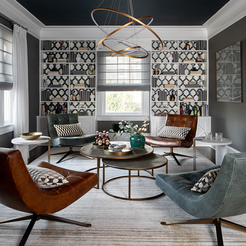 This lounge area is a prime example of a room that makes a lasting impression. Once a little-used formal living room, Wolf transformed it into a space to retire to with guests for after-dinner conversation and relaxation. Inspired by mid-century modern design, Wolf surrounded a Four Hands double-round coffee table with four Barcelona-style chairs from Lee Industries, including a striking pair in tan leather. There are a few right angles in the lounge’s other furnishings, emphasizing the room’s cozy intentions. The circles descending from the Circular Ring chandelier from Warmly Décor are echoed in the occasional tables from Harrington.