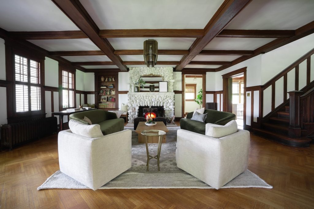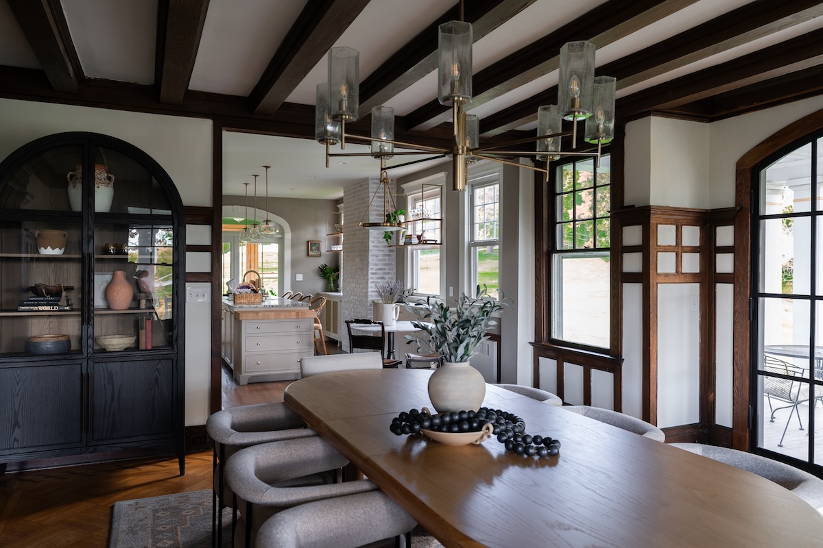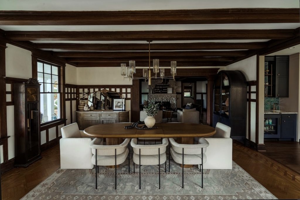 But refreshing the historic living and dining rooms relied on two key tools: furniture and lighting. “We leaned into modernizing with curvature,” Acosta says. “With all the wood panels and beams, there were a lot of straight lines. Playing with shapes makes things feel more curated.”