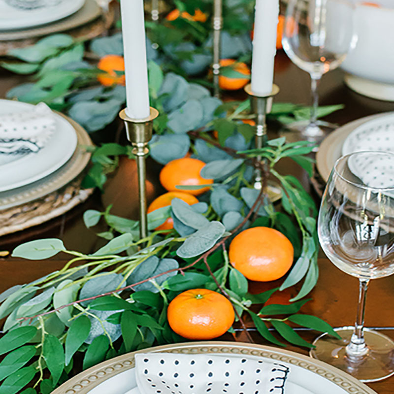 An attractive centerpiece need not be tall or grandiose. You can, for instance, simply weave branches and leaves from the yard (be sure to clean them off before bringing them inside) between brass candle holders and highlight them with bright fruit. “The proper height of a centerpiece can make your guests remember and appreciate the beauty of what’s on the table— versus popping their head over and around your décor like a meerkat popping out of a hole,” quips Baker. Going too large here, she explains, “is like having furniture that’s too big for a room. When it doesn’t fit, you really notice.”