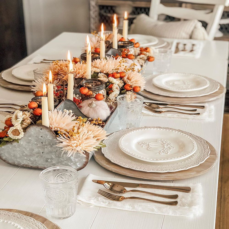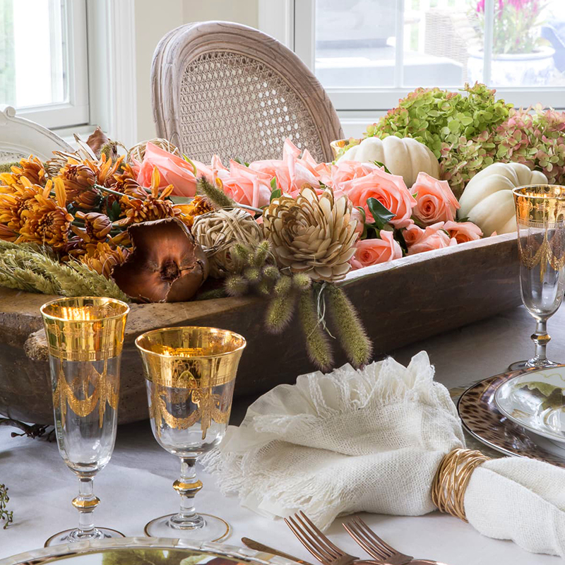 When it comes to decorating a table for fall, there are seemingly countless styles, colors and pieces you can use. You can achieve a cozy, rustic look by filling each compartment of a vintage metal caddy with fall flowers, pumpkins and candles. “Seasonal elements give a composition a time, a place and an identity,” notes Baker. “Roses, orchids and other classic popular elements can be used any time, but playing with the colors and textures from the natural elements found at this time of year can create the rustic, warm and inviting feeling we want.”