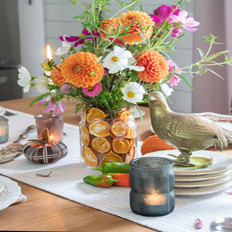 No matter the season, a fruit-and-floral combination can lighten any tablescape. For a runner-covered table, fill a clear vase (or use several mason jars in varied sizes) with sliced, dried fruit and your favorite flowers, store-bought or straight from the yard. You can even use dried flowers or branches, or whatever else you have around that looks interesting. Again, just make sure the arrangement doesn’t tower over the table. “My favorite flowers to include are Dutch antique hydrangea, hellebores, viburnum berries, garden roses and Amaranthus,” says Baker. “Colors I gravitate to are butter yellow, olive green, aubergine, copper, espresso brown and smaller pops of mustard yellow or orange.” Baker’s rule of thumb when it comes to height of florals: “The person you’re talking to should be framed by flowers, not hiding in a bush.”