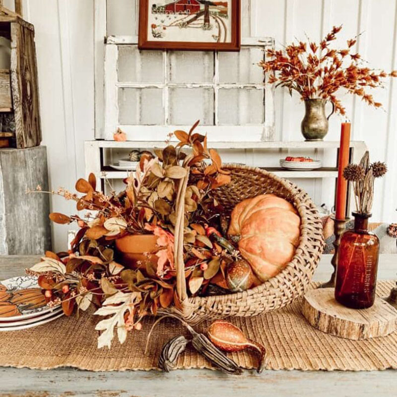 A dough bowl is another kitchen vessel that can be used for a table centerpiece. For an unexpected yet chic arrangement, mix classic fall colors such as yellow, orange and brown with a pop of lively, peach-tinged roses. Another surprising centerpiece idea? Try “using plants in terra cotta pots and fall leaves and pinecones instead of traditional greenery,” Baker says.