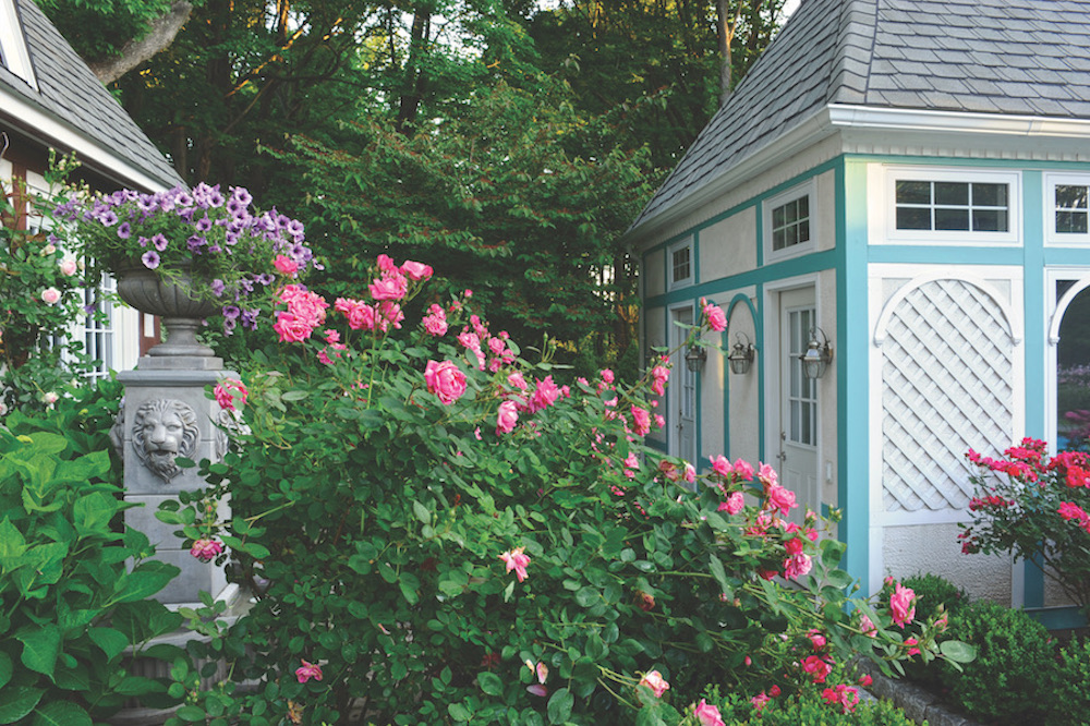 Today, roses are everywhere on the grounds of the couple’s 1927 Tudor. There are climbers, shrubs and a long parade of some of her favorites in front of the pool house.
