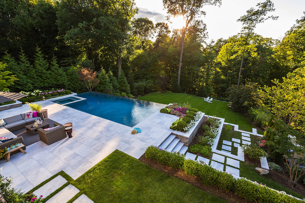 When Jill and Paul McKeon bought a center-hall colonial in Ridgewood, their plan was to renovate the house but not the landscape, which had gone through a substantial redo only a year earlier. All they really wanted to do was add a pool, and the logical place for it—the only place for it, really, given the extensively terraced property—was at the very bottom of the steeply sloped backyard. But when their landscape designer, Thomas Flint of Thomas Flint Landscape Design & Development in Midland Park, offered them the option of siting the pool at the top of the property, it just felt right.