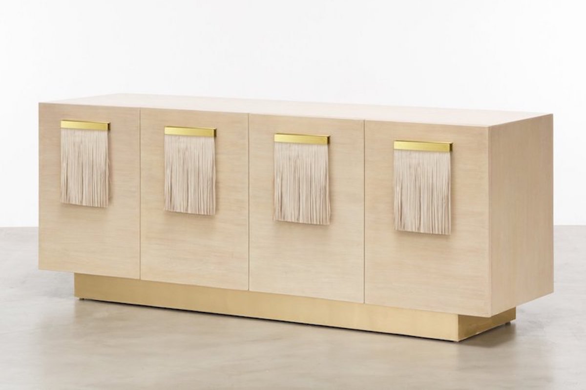 This chic media cabinet has us California dreaming, with its bleached white oak, brass and creamy leather fringe work. Available at shomodern.com.