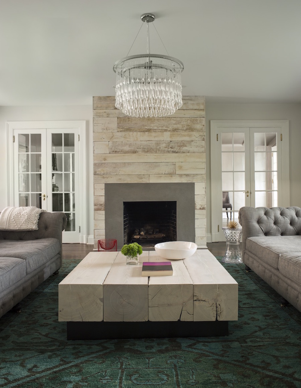 On the first floor, walls came down to open the kitchen area to the family room, where two couches from Restoration Hardware flank a coffee table made by Grochowski from huge beams of wood salvaged from an old casket factory. “What I love about the table is that you see the history in the end grain and all the rings,” says the designer. “You think about how old that tree was, then its second life as a structure and now its third life as a table.”