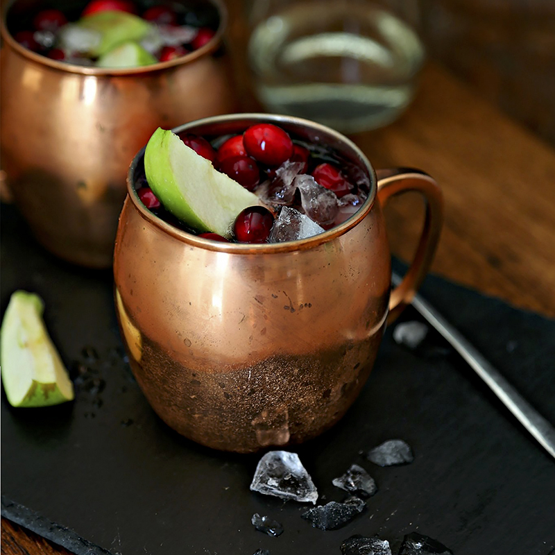 When ready to serve, fill two copper mugs half way each with shaved ice. Into each cup add: half vodka, half cran-apple juice. Add desired amount of cranberry simple syrup to each. Top off with ginger beer. Garnish with remaining cranberries and apple slices.