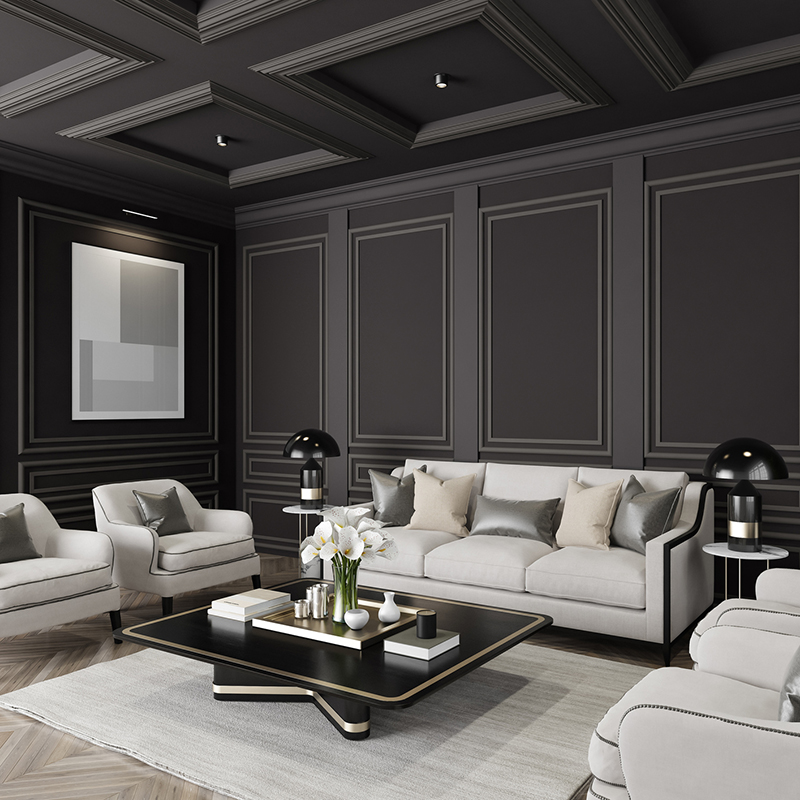 Why stop at paint? A world of design options opens up to you once you start considering the ceiling as a true fifth wall. Tara Rotelli of Rotelli Interiors in Hasbrouck Heights suggests a twist on a classic: “If you want something even more enchanting, apply decorative molding to the ceiling, install some crown, and then paint.”