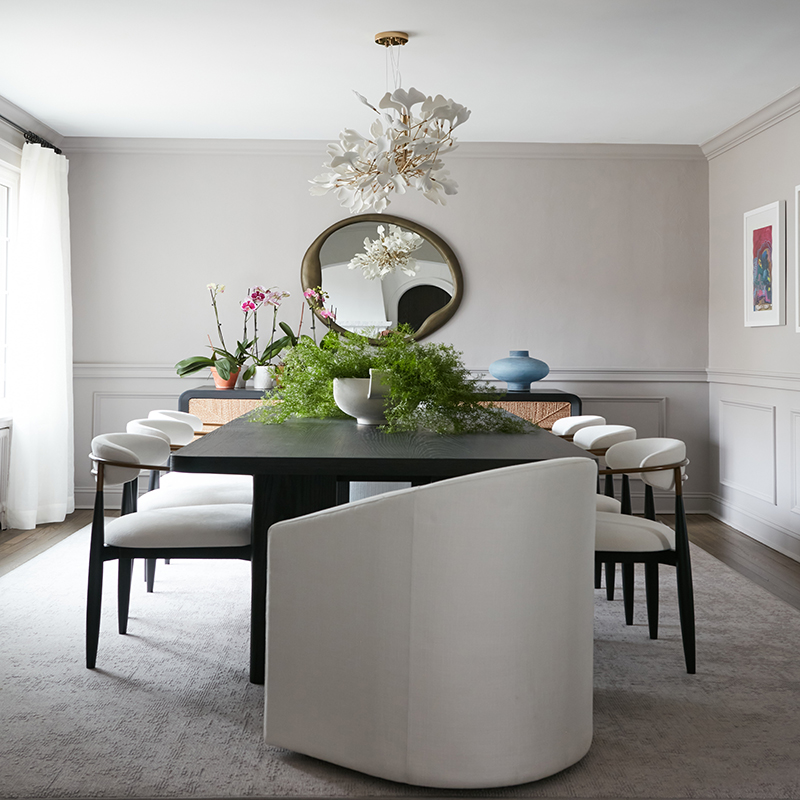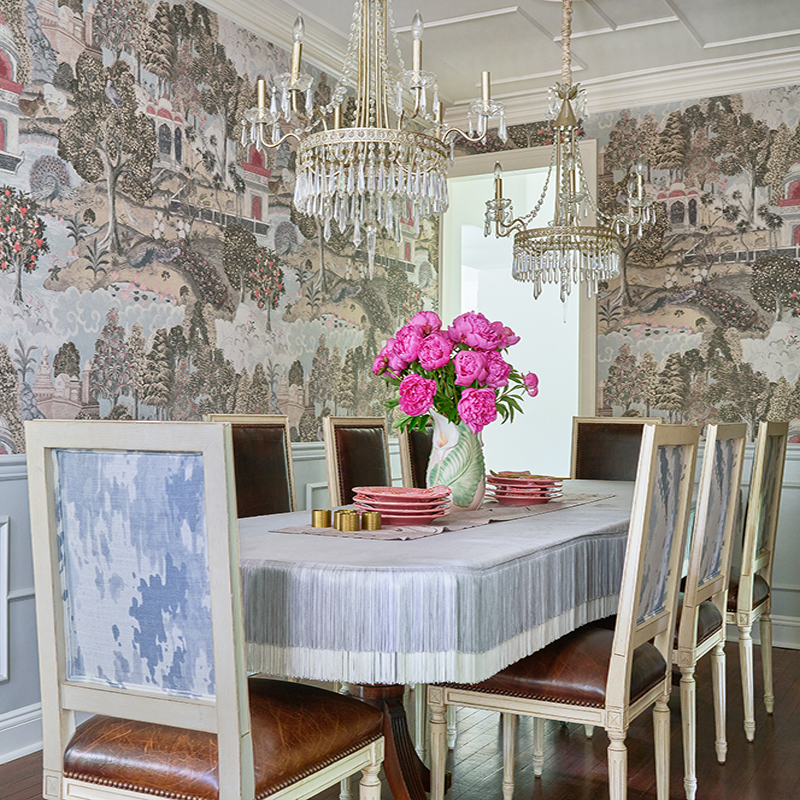When creating her own Ridgewood home, Kristina Phillips of the eponymous design firm had fun in the dining room, pairing whimsical wallpaper with duel chandeliers to for the perfect space for dinner parties.
