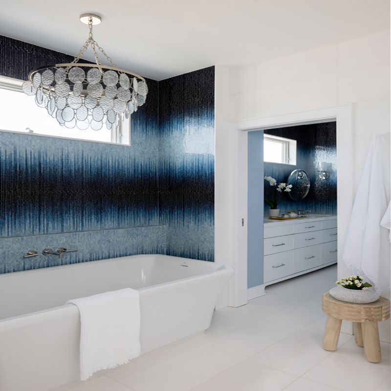Under the skilled hands of Karen Wolf of K + Co Living, every inch of an Long Beach Island vacation retreat captures the ocean vibe, and the bathroom is no exception. Over the tub, a chandelier recalls sea glass without overwhelming to ombre tiles on the walls.