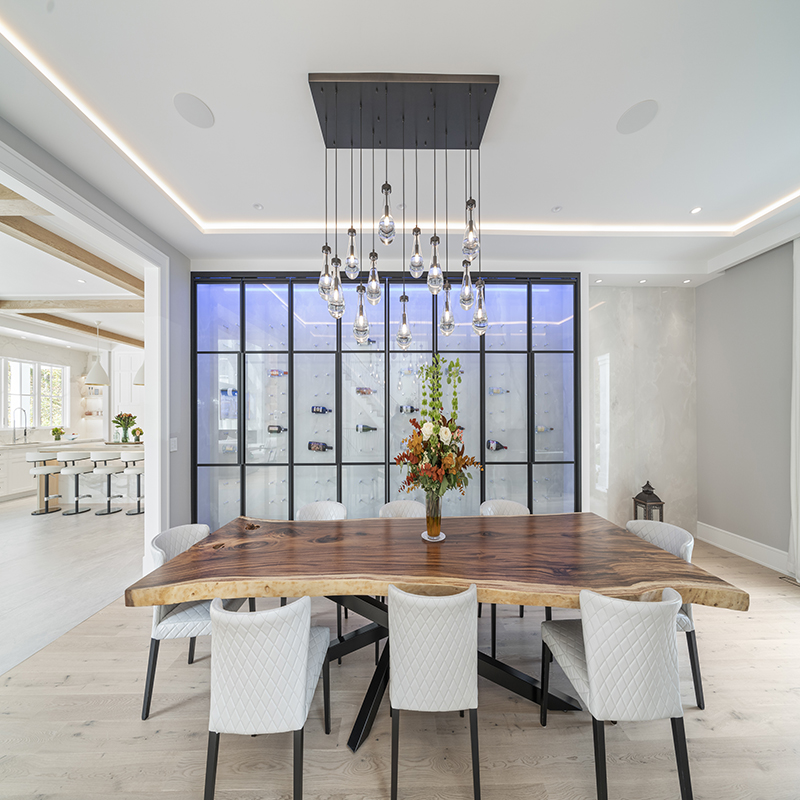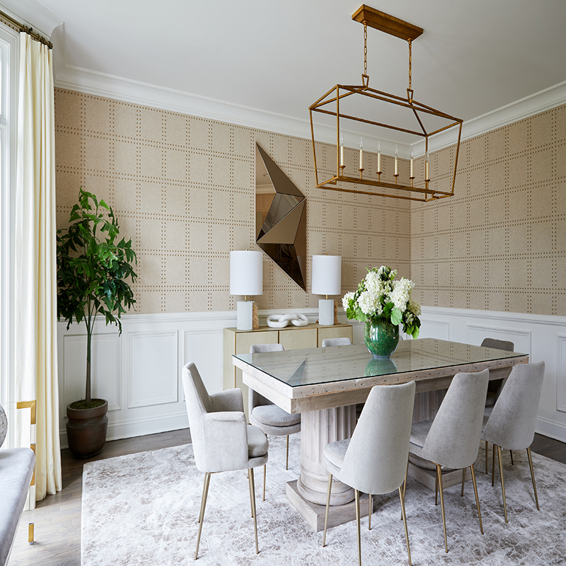 Designer Jodi Berger of JLA Designs was tasked with bringing timeless elegance to a Livingston colonial, and the dining room is that aesthetic embodied. Up above, the structural light creates the perfect visual centerpiece and echoes the warm, bronze tones from the wallpaper and mirror.