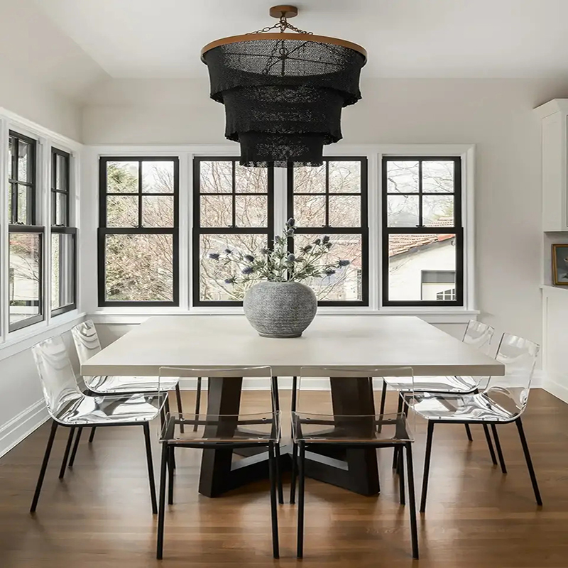 Over in Summit, a kitchen reno created by Megan Pisano features an eye-popping black pendent over the informal dining area. It perfectly complements the table beneath, made of concrete and oak.