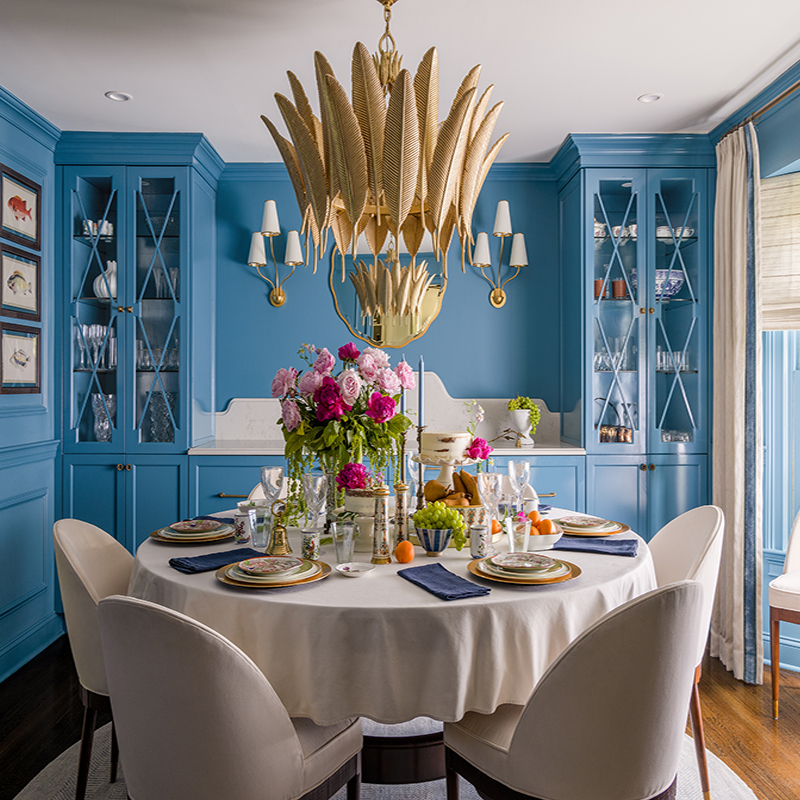 Despite being drenched in a bold, beautiful blue, the showstopper of this Madison dining room, designed by Plume Interiors, is the feather motif chandelier. The simple ivory wall sconces on the wall behind it create the perfect counterbalance.