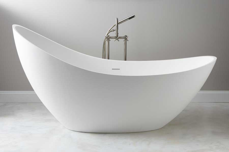 The fresh white matte finish of the sleek and spacious Ballico Resin Freestanding Slipper Tub from Signature Hardware provides a calming atmosphere to unwind in after a long day.