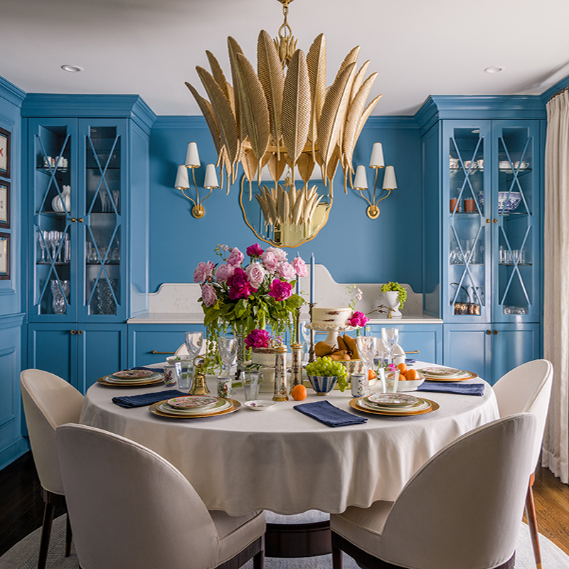 As for the living/family space, Hunkele designed the dining room’s cabinetry. Commanding one wall, the built-in encompasses glass-fronted storage towers on both ends, while the buffet section’s paneling conceals an icemaker, a wine fridge, a fridge/freezer and serveware drawers. The white quartz backsplash functions as a built-in serving table. The Corbett Lighting Featherette chandelier “adds fun and unexpected drama to the formal space.” And Benjamin Moore’s Notting Hill Blue packs the pièce de résistance wow.