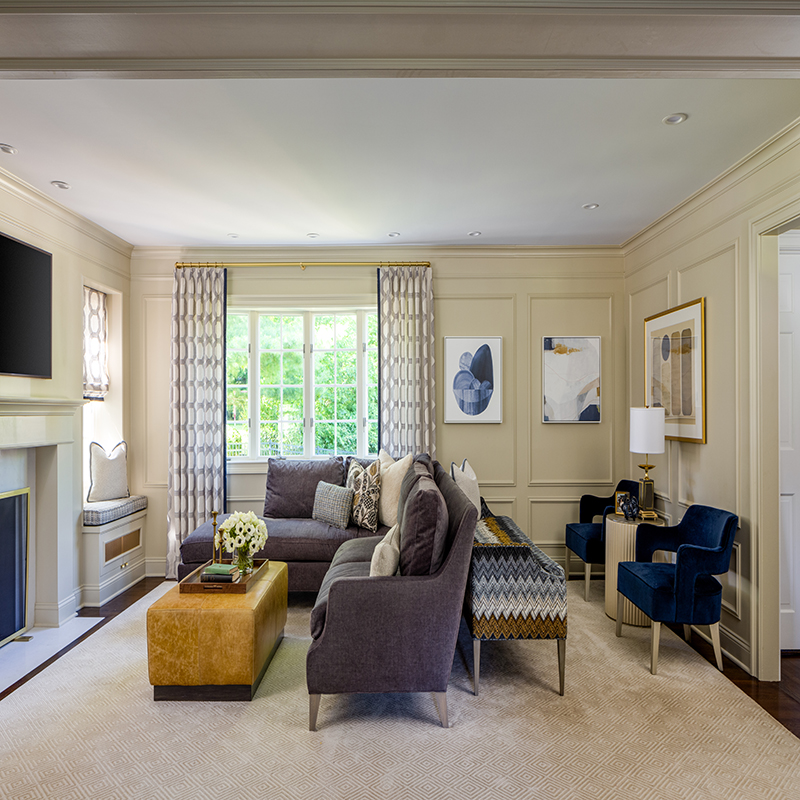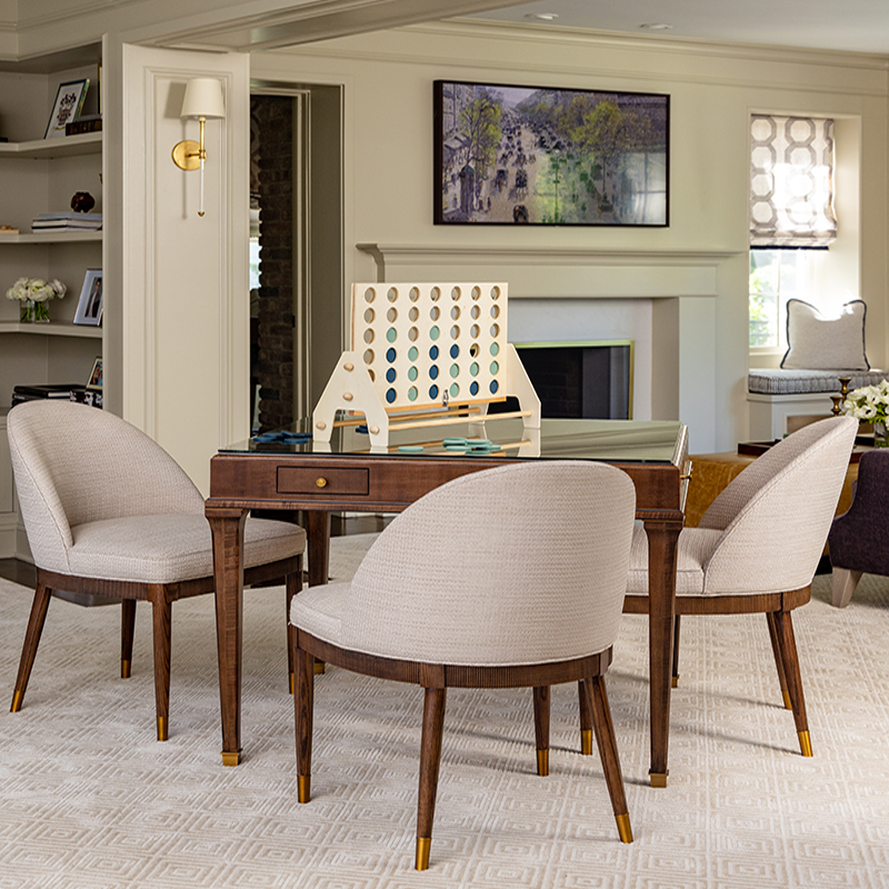 The homeowners, who live on a kid-filled cul-de-sac where families frequently socialize, requested an open-concept living/family space for hosting multigenerational groups of 15+ neighbors in practical style. They wanted two distinct zones—one with an adult, lounge-like vibe, the other for more family- and kid-friendly interactions—that could function independently or together. So Hunkele chose an Austin two-piece sectional in JF Fabrics Silken high-performance fabric, a Vanguard Donya bench and two velvet-upholstered Century accent chairs. The weathered leather coffee table and Camille side table are great for holding cocktails or TV-night snacks, while the custom, built-in window bench provides seating and out-of-sight storage. The Four Hands Sirius table in antique brass, one of several throughout the home, easily moves as needed for entertaining. For cohesiveness, Hunkele embraced both areas with wall moldings. She used Benjamin Moore’s Coastal Fog but switched things up by using matte on walls, shiny on trims; Camille wall sconces were repeated throughout.