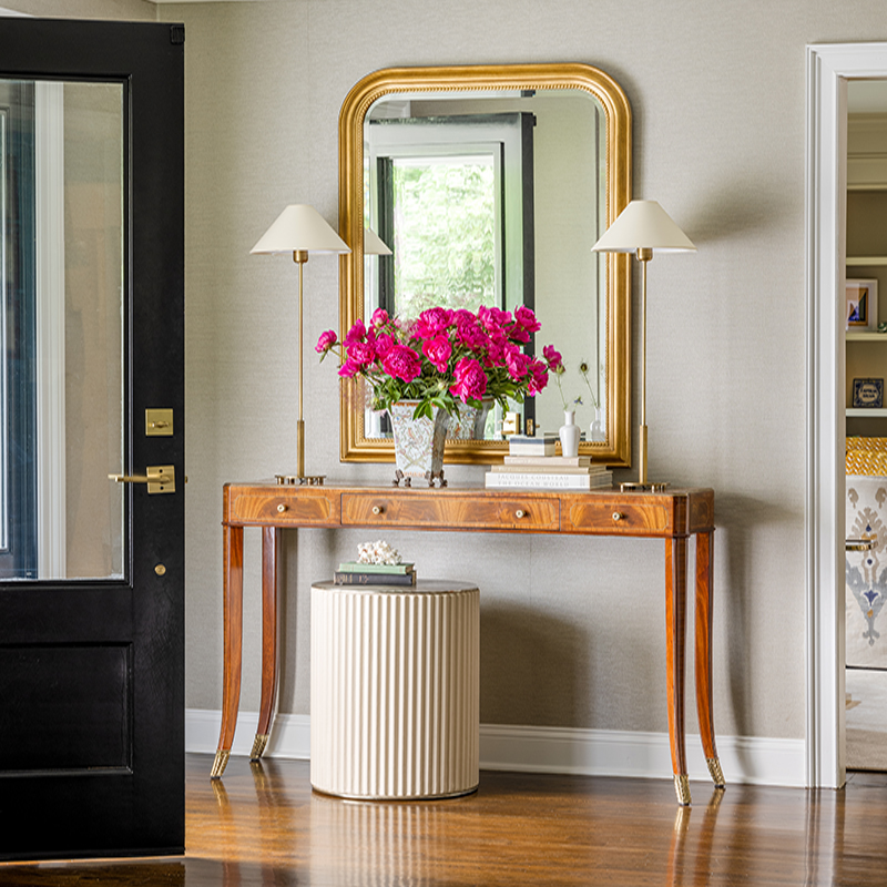 Soon the homeowners were green-lighting Hunkele’s vision of “today’s traditional with a twist: fresh, fun, bold, fanciful in some cases—classic and sophisticated in others. Mixing patterns, colors and shapes along with pieces with meaning gave us the look we were going for,” she says.