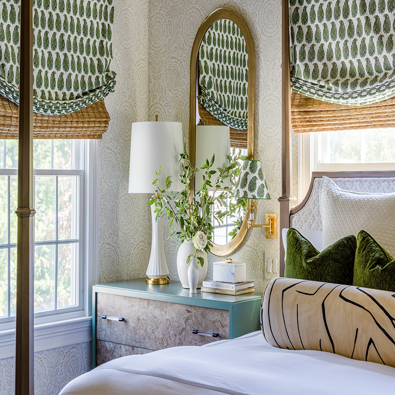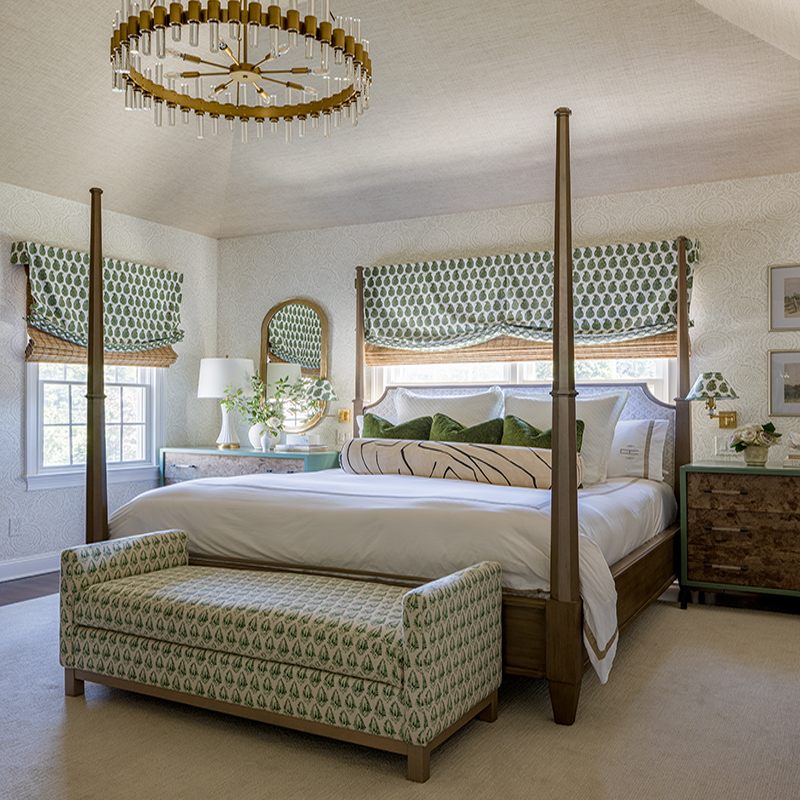 In the primary bedroom, ivory Lee Jofa wallpaper pampers the walls as a neutral Phillip Jeffries grass cloth on the 13-foot ceiling imparts coziness. The solid maple king poster bed is upholstered in a sumptuous Villa Nova Koji reversible weave. The Window Works treatments feature custom jute-woven Roman shades topped with decorative relaxed Romans in Gaston Y Daniela’s Tarsila Verde fabric. On either side of the bed, matching custom dressers feature antique bronze metal legs, Amate drawer faces and tops/sides painted with Benjamin Moore Cushing Green. The antique brass wall sconces sport customized shades using the same Gaston Y Daniela fabric. The headboard’s geometric quilting provides rich texturing on a buttery chenille surface while the bolster’s bold graffiti print creates tension in an otherwise traditional design. At the foot of the bed, the CR Laine bench beckons in Agave Boxwood fabric.