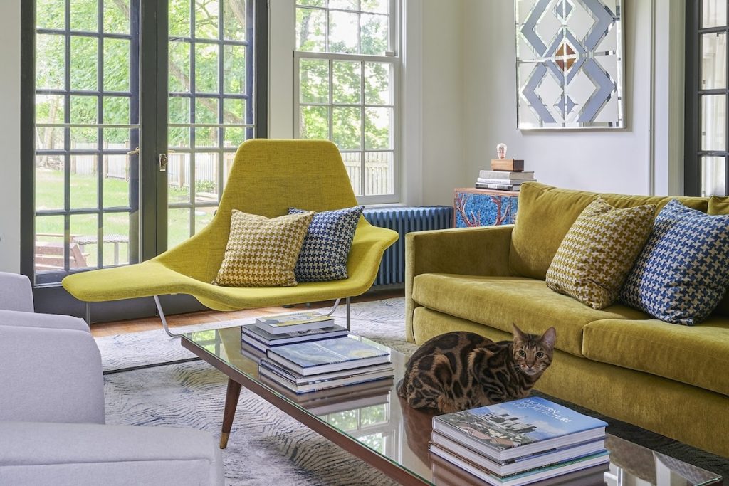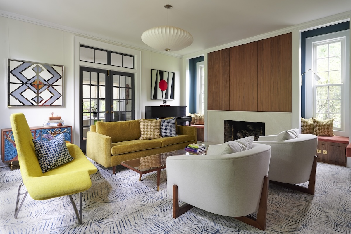 In a Dutch colonial home in Maplewood, curved lines in the living room’s lemony chaise longue are among rounded elements designer Risha Walden used to inject a mid-century modern aesthetic.